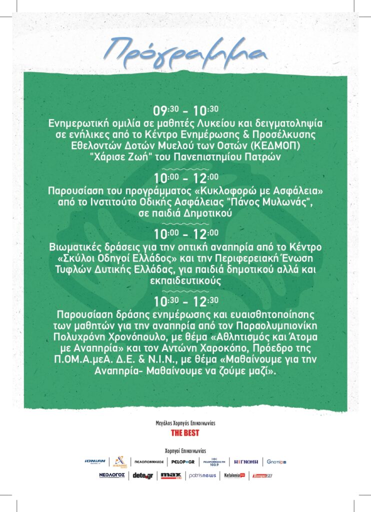 - Βιωματικές δράσεις για την οπτική αναπηρία από το Κέντρο «Σκύλοι Οδηγοί Ελλάδος» και την Περιφερειακή Ένωση Τυφλών Δυτικής Ελλάδας,