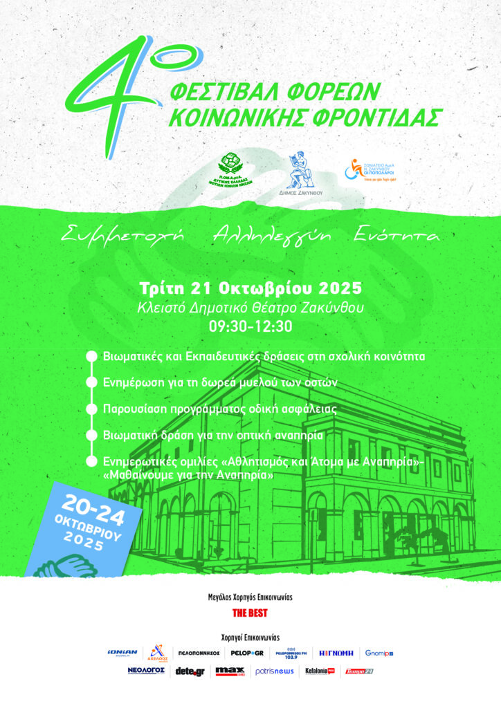 Το 4ο Φεστιβάλ Φορέων Κοινωνικής Φροντίδας που διοργανώνει η Περιφερειακή Ομοσπονδία Ατόμων με Αναπηρία Δυτικής Ελλάδας και Νοτίων Ιονίων Νήσων συνεχίζει τη φετινή του πορεία, με σταθμό τη Ζάκυνθο, την Τρίτη 21 Οκτωβρίου 2025, στο Κλειστό Δημοτικό Θέατρο Ζακύνθου.